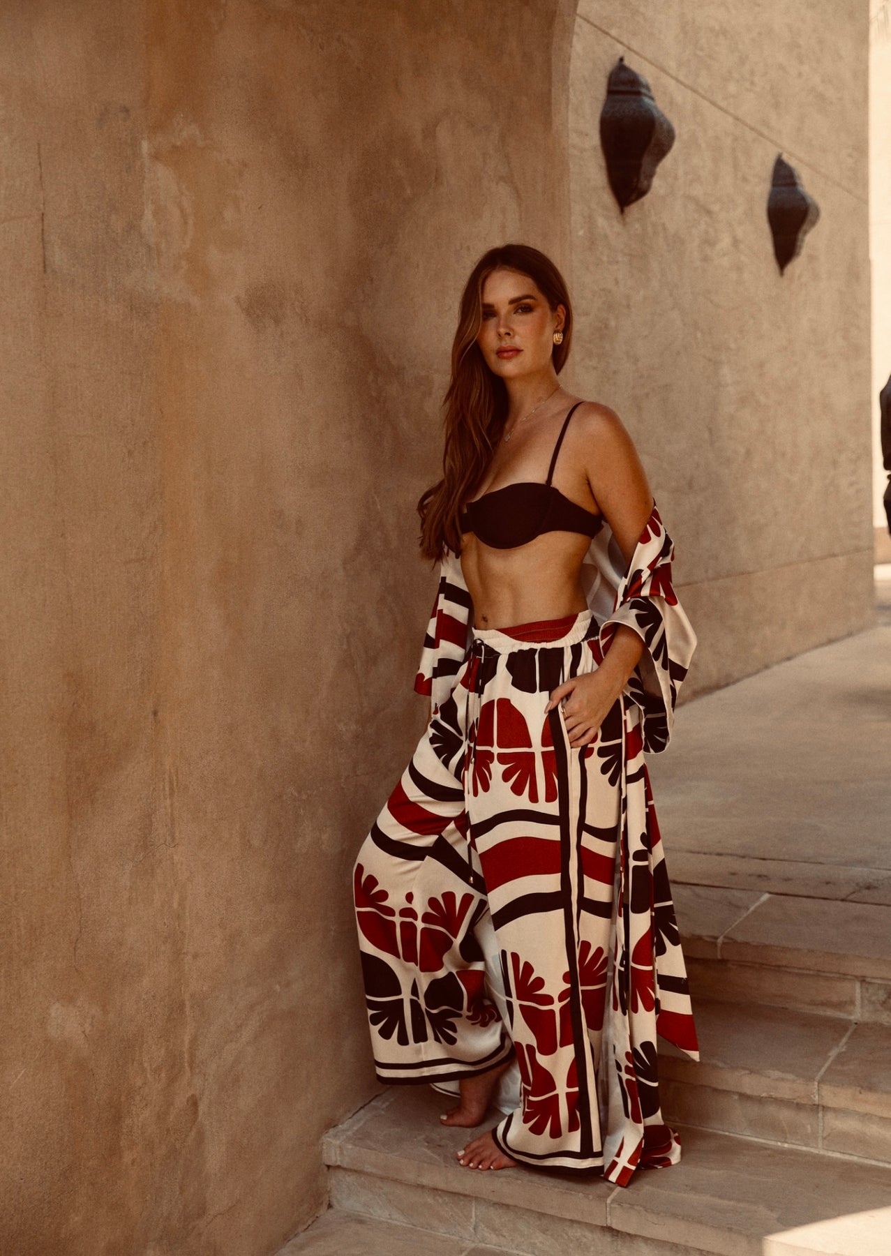 As featured in the HIGH SUMMER 25 ’ Lookbook, Meet ATLANTIS our new PHAIR Signature print in burnt orange and brown on the most show stopping floor length Kimono.